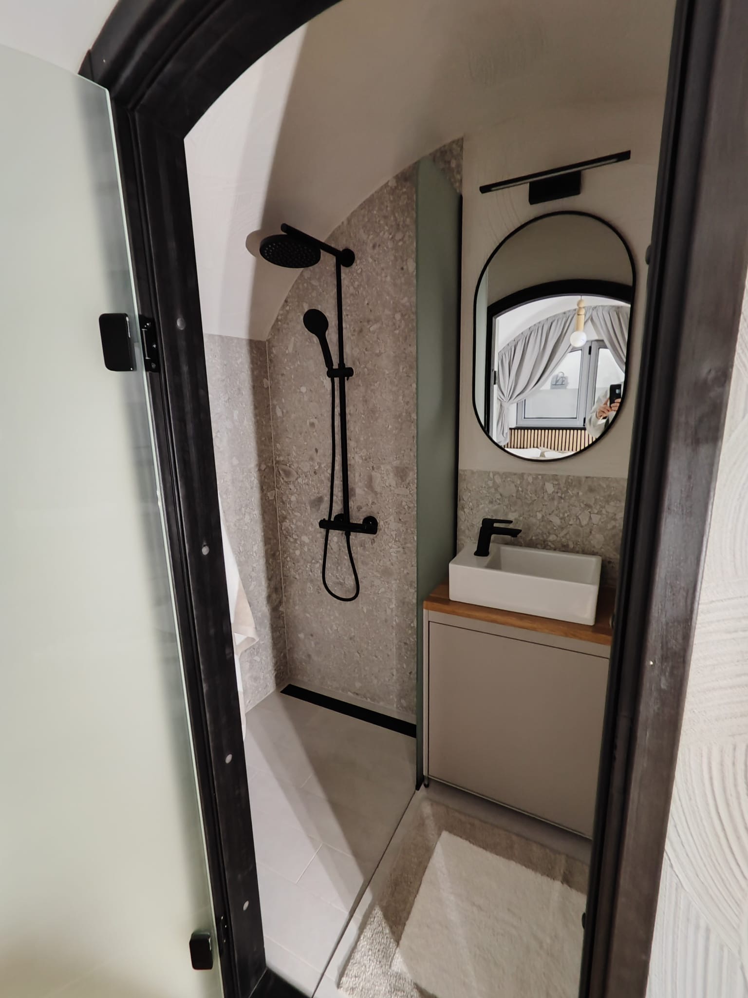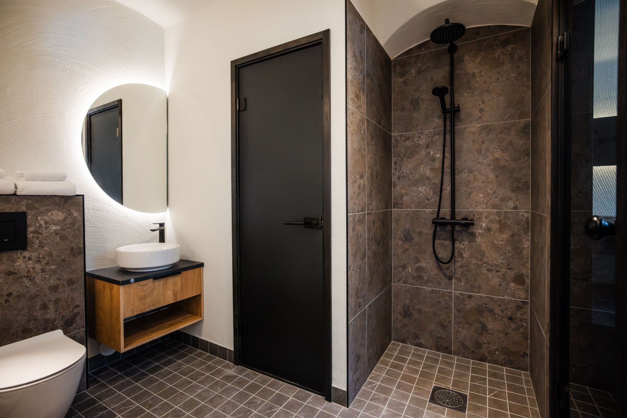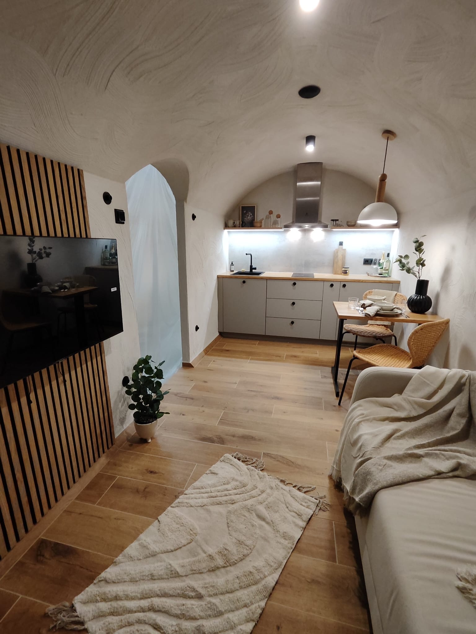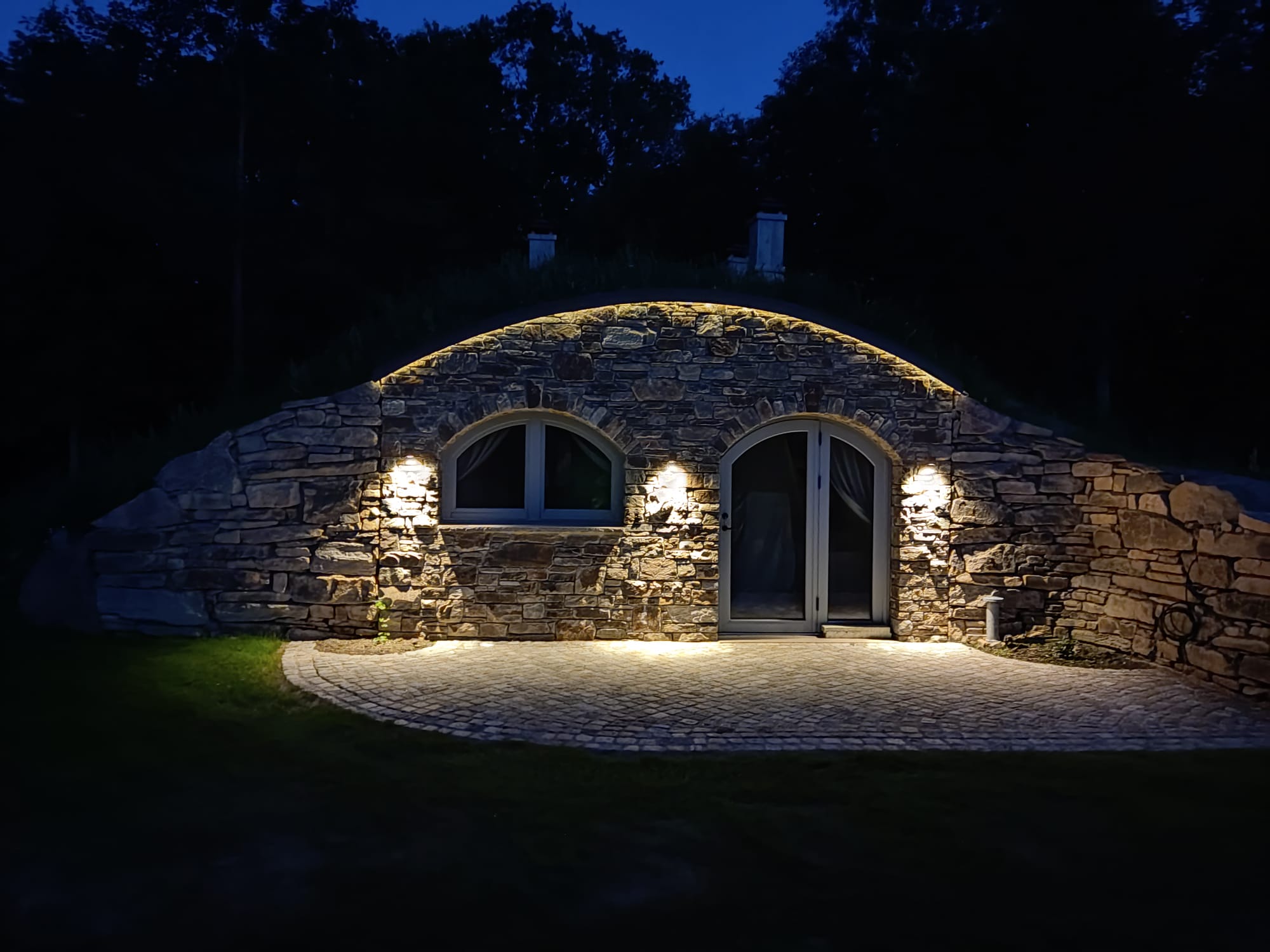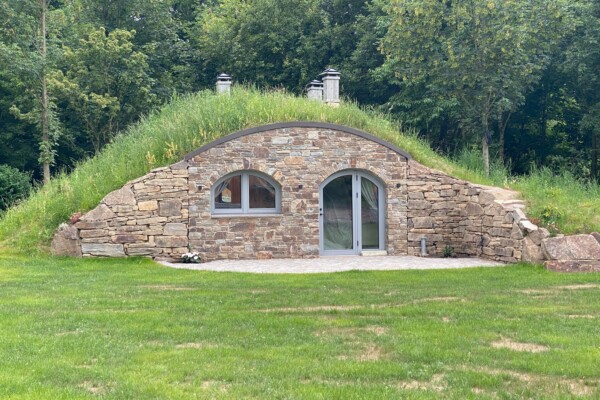 Från utsidan känns det som en del av sluttningen. Kliv in genom de välvda dörrarna och du möts av ett fullt utrustat och noggrant utformat inre: kök, vardagsdel och badrum — allt format av den välvda betongstrukturen som håller en jämn temperatur året runt.