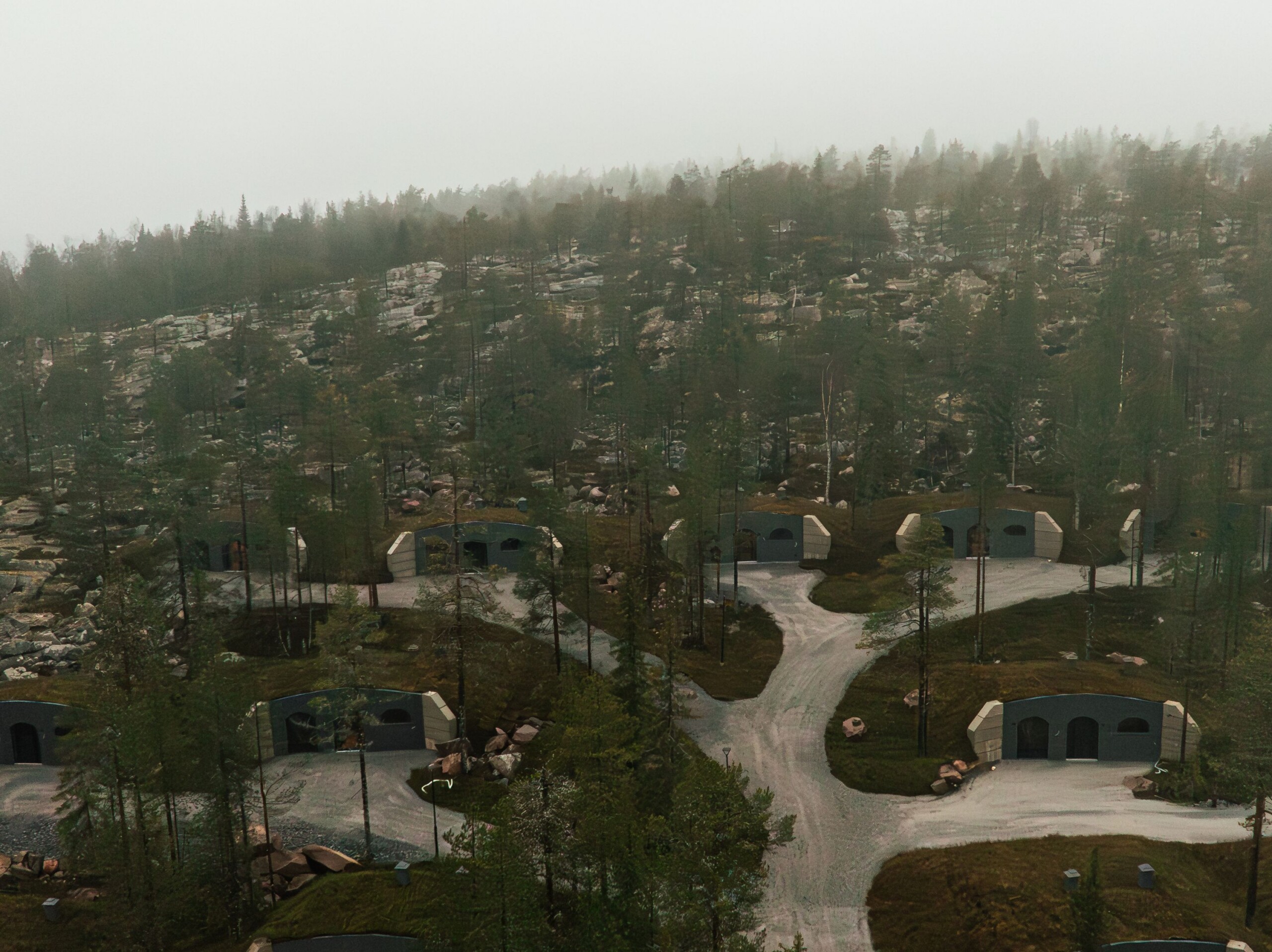 Vi byggde 80 modulära underjordiska sviter i som smälter harmoniskt in i Aavasaksas landskap — som om de alltid hört hemma där. Täckta av jord och formade av välvda betongstrukturer håller sviterna ett naturligt stabilt inomhusklimat året runt, med låg energiförbrukning.